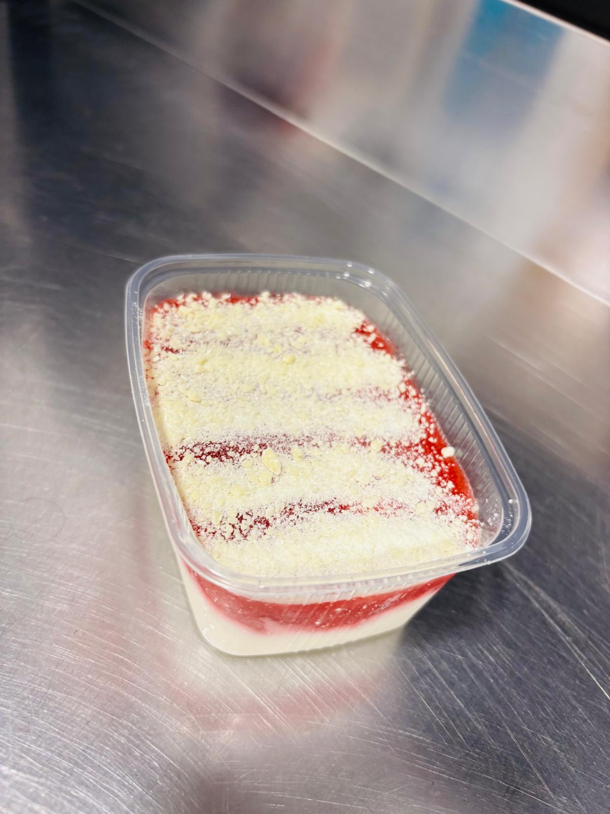 Eine Portion hausgemachte Mascarpone-Erdbeer-Creme mit weißen Schokoraspeln garniert